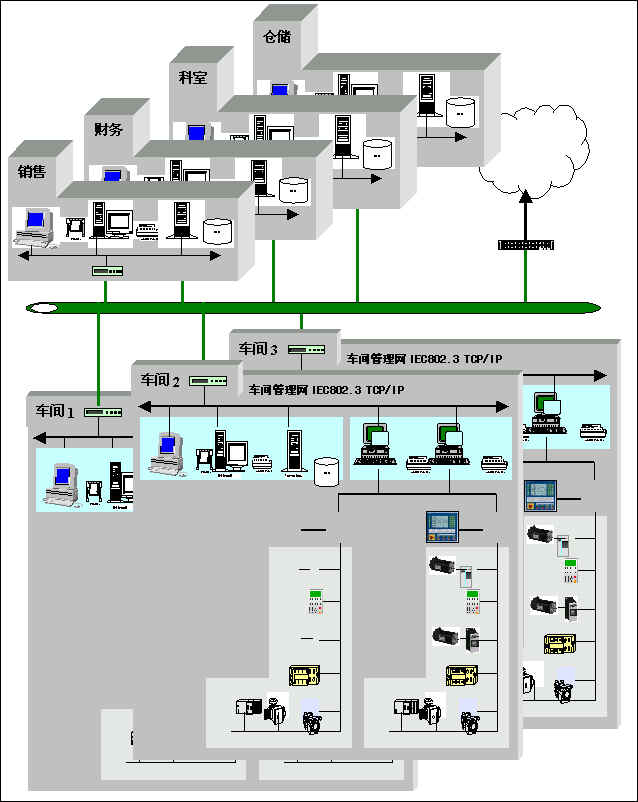 (3) 工厂管理层:车间操作员工作站可通过集线器与车间办公管理网连接,将车间生产数据送到车间管理层。车间管理网作为工厂主网的一个子网。子网同过交换机、网桥或路由等连接到厂区骨干网,将车间数据集成到工厂管理层。如下图3-2所示。